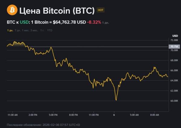 5 февраля биткоин оказался на грани пробития психологической отметки в 70 000 долларов, упав до 70 052,38 доллара, что было самым низким уровнем с ноября 2024 года.