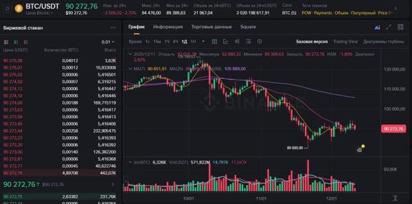 Следует отметить, что, по информации платформы Binance, по состоянию на 10:00 биткойн стоил 90 272,76 доллара.