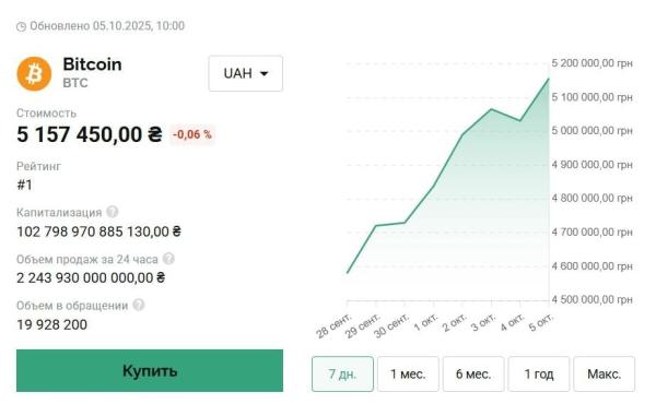 По данным портала Минфин, по состоянию на 10:00 5 октября курс биткоина в гривнях стоит 5157450 гривень за монету.