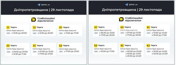 В частности изменения затронули Днепропетровскую область. Обновленные графики отключений на 29 ноября для этого региона выглядят следующим образом.