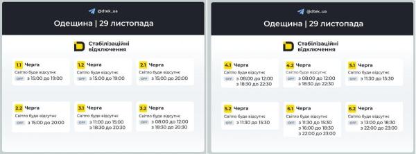 Компания ДТЭК опубликовала обновленные графики почасовых отключений света на субботу, 29 ноября. Об изменениях сообщает Телеграм-канал предприятия.