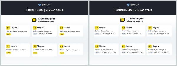 Энергетики предупреждают, что время и масштаб ограничений могут меняться в зависимости от нагрузки в сети и текущей ситуации. ДТЭК в своем Telegram-канале опубликовал график выключения света для Киевской области и Киева.