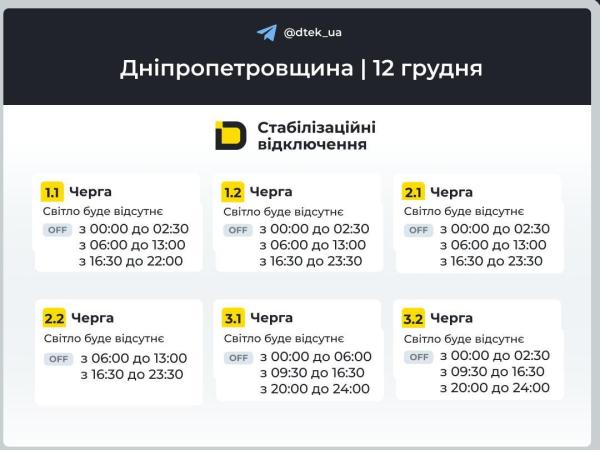 Энергетики не указывают, сколько очередей отключения будет задействовано в пятницу, 12 декабря, однако из предварительных заявлений главы «Укрэнерго» Виталия Зайченко можно сделать вывод, что отсутствие света у населения продлится примерно 12 часов в сутки.