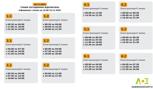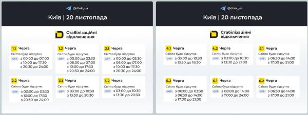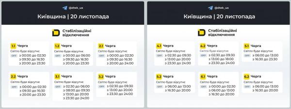 ДТЭК обнародовал графики отключений на 20 ноября в Киевской области. В четверг отключения для всех очередей будут происходить в три или четыре этапа в течение всех суток.