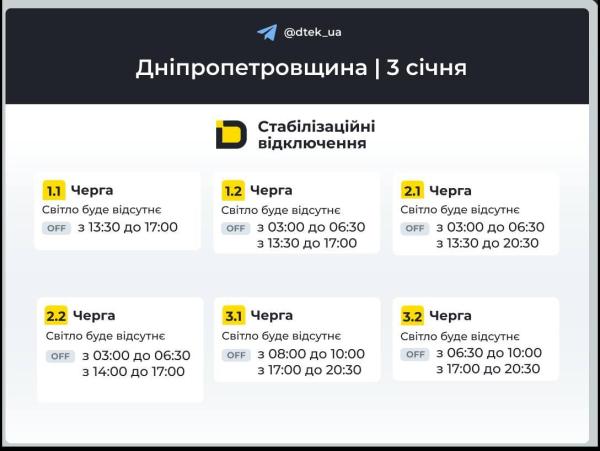 Компания ДТЭК обнародовала график отключений в Днепропетровской области на 3 января. Согласно ему, большинству очередей потребителей в субботу в течение суток дважды будут отключать свет. В целом жители Днепра и области будут сидеть без света, в зависимости от очереди, от 3,5 до 10,5 часов.
