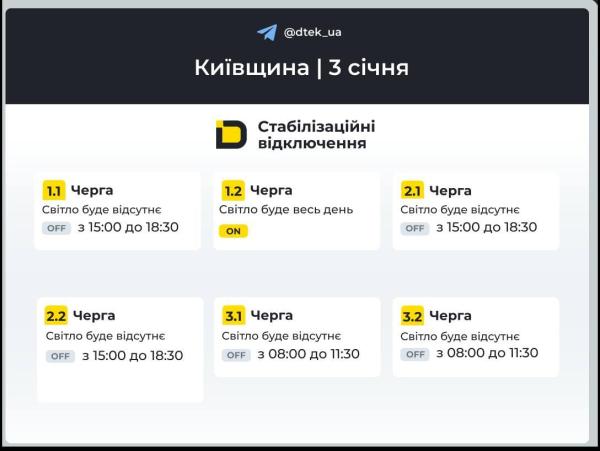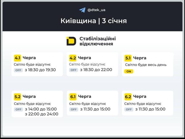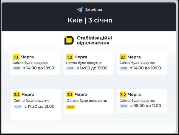Остальным киевлянам, согласно графику на 3 января, один раз будут отключать свет на 3-5 часов, в зависимости от очереди потребителей.