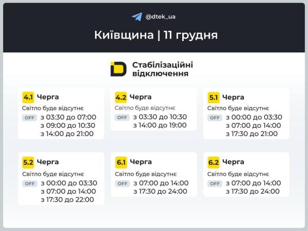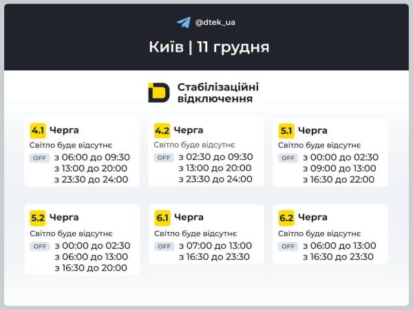 Компания ДТЭК обнародовала график отключений на 11 декабря для Киева. В столице 11 декабря большинству очередей потребителей в течение суток трижды будут отключать свет. Согласно графику, киевляне будут сидеть без света более 10 часов.