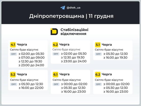 На Днепропетровщине одной из очередей 11 декабря свет будут выключать в течение суток 4 раза, сообщает ДТЭК. Как и жители Киева и области Днепропетровщина будет сидеть без света 11 декабря более 10 часов.