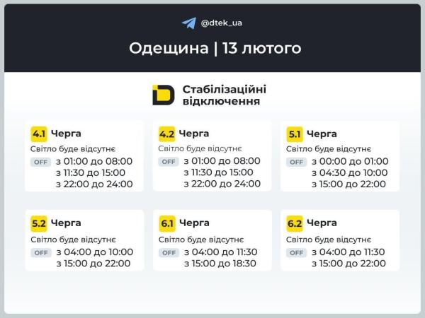 Компания ДТЭК обнародовала графики отключений света для Одесской области на 13 февраля. Согласно ему, в пятницу большинству очередей потребителей, которые получают электроэнергию по графику, трижды будут отключать свет. В целом большинству из них предстоит провести более полусуток в темноте.
