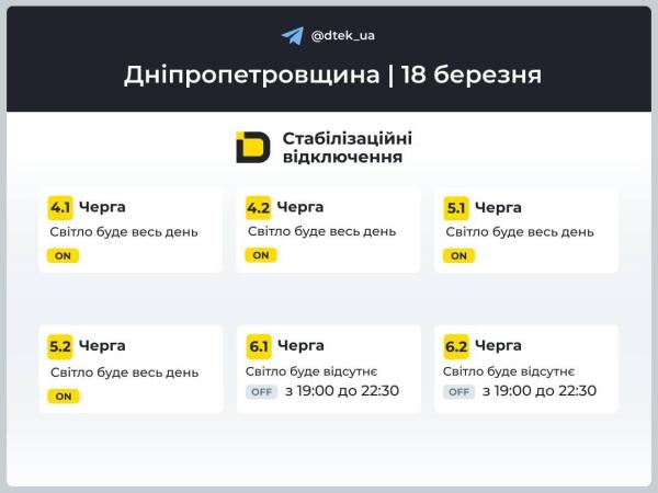 По информации ДТЭК, в Днепропетровской области большинству групп потребителей сегодня свет будут отключать по одному разу на 1,5–3,5 часа. В то же время группы 4.1, 4.2, 5.1, 5.2 будут с светом до конца суток.
