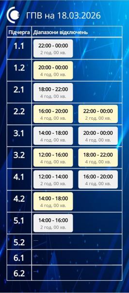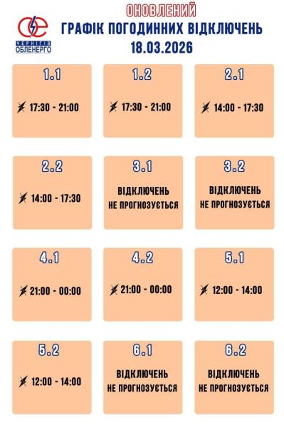 В Черниговской области 18 марта электроэнергия также будет отключаться для большинства групп потребителей по одному разу. Согласно графику, обнародованному «Черниговоблэнерго», большинство жителей Чернигова и области будут сидеть без света от 2 до 3,5 часов. В то же время подгруппы 3.1, 3.2, 6.1 и 6.2 будут с светом все время.