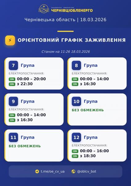 В Черновцах и области 18 марта свет будут отключать всем очередям потребителей. Как сообщает «Черновцыоблэнерго», жители области поочередно будут сидеть без света 2,5 часа.
