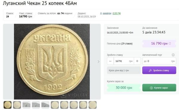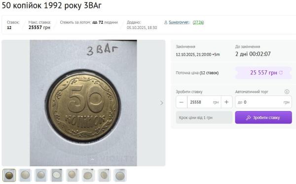 К примеру, среди таких редких и стоимостных образцов, на аукционе сейчас торгуются 50 копеек разновидности 3ВАг 1992 года выпуска. Максимальное ценовое предложение уже составляет 25 557 гривень, а до окончания аукциона еще остается почти 2 дня. Об этом свидетельствуют данные на площадке Violity.