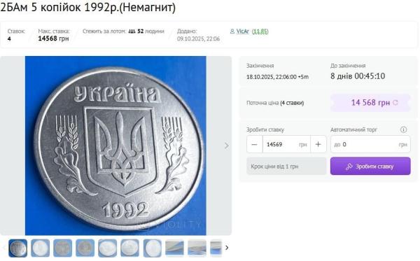 Следующий интересный лот — 5 копеек 1992 года выпуска. Максимальная ставка по этой монете сейчас — 14 568 гривень, а дата завершения торгов — 18 октября.