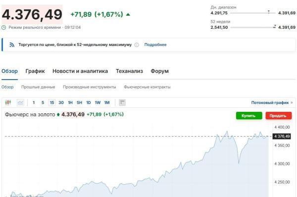 Агентство Reuterts пишет, что спотовое золото достигло отметки в 4362,39 доллара за унцию по состоянию на 04:39 по Гринвичу, после того как ранее достигло нового рекордного уровня в 4378,69 долларов. Фьючерсы на золото в США с поставкой в декабре подскочили на 1,7% до 4375,50 долларов.