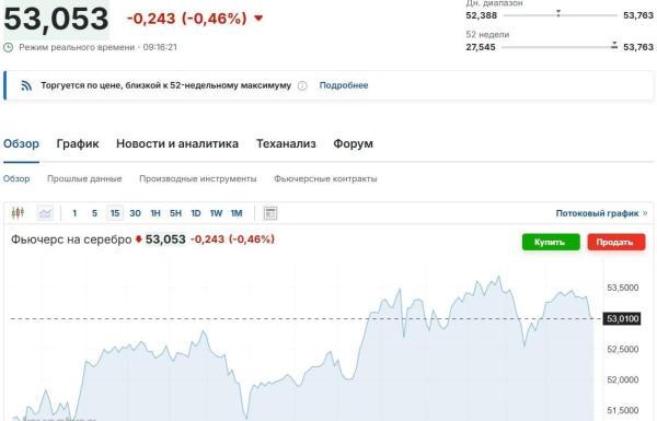 По данным биржи investing, по состоянию на 9:16 цена серебра достигла отметки в 53,05 доллара за унцию. Таким образом, 1 грамм металла стоит 1, 71 доллара.