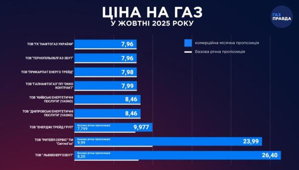 Украинские поставщики «голубого топлива» обнародовали цены на газ на октябрь 2025 года. Годовые тарифы, прогнозируемо, не изменились, а месячный тариф у одной из компаний превысил 26 гривень за кубометр, пишет Газправда.