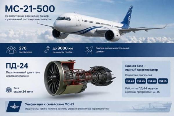 МС-21-500 рассчитан на 270 пассажиров (МС-21-300 рассчитан на 160–210 мест). Ключевая особенность самолета – новый двигатель ПД-24 тягой около 24 тонн, который позволит авиалайнеру летать на расстояние до 9000 км и выйти в нишу Boeing 757 и Boeing 767.
