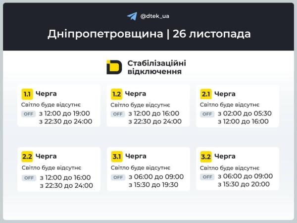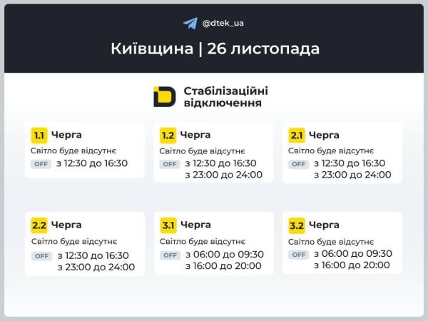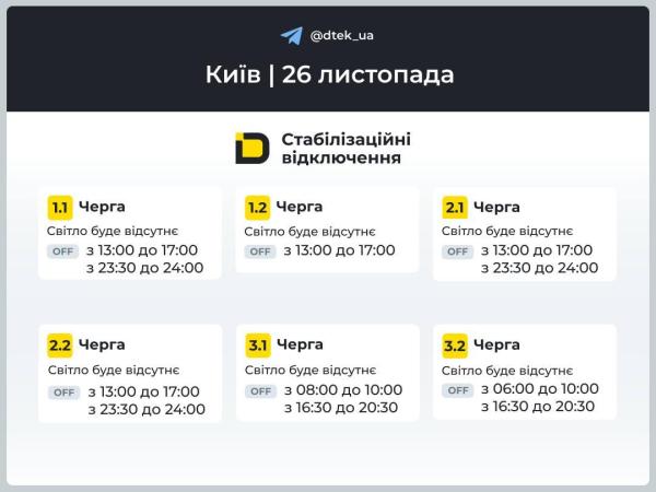 Графики отключений света на 26 ноября для Киева, Одесской, Днепропетровской и Киевской областей обновили.