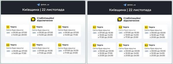 Обновлено в 19.46. Компания ДТЭК обнародовала график отключений для Киевской области на 22 ноября. Согласно ему, в субботу свет будут отключать всем очередям потребителей столичной области, а одна из очередей будет сидеть без света более 13 часов.