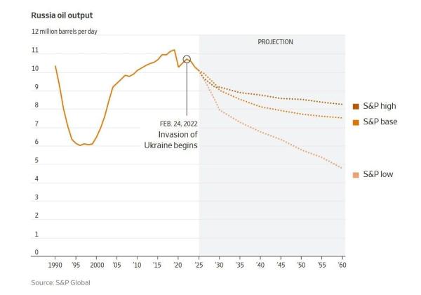 Кроме того нефтедобывающая отрасль России страдает от последствий самой войны — часть персонала деньгами или принуждением отправили на фронт, некоторые сбежали за границу. К тому же правительство повысило налоги для нефтяников, чтобы финансировать свою войну.
