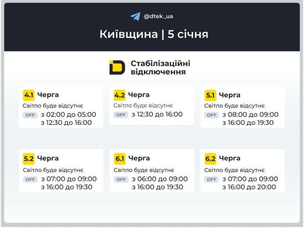 Ранее УНИАН публиковал графики отключений света на 5 января для столицы и регионов Украины. В ДТЭК напомнили, что дефицит в системе возник в результате продолжающихся массированных российских атак на энергетическую инфраструктуру Украины.