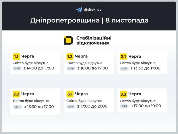 Кроме того, на Днепропетровщине для некоторых жителей города электроэнергия может отсутствовать от 1 до 6 часов. При этом две очереди потребителей будут свет весь день.