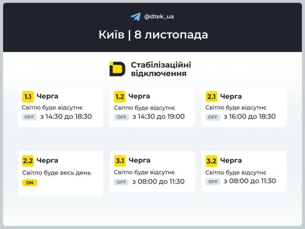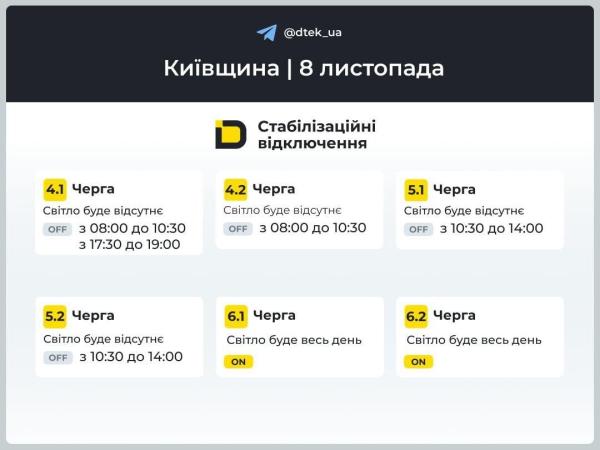 В Киевской области 8 ноября предусмотрено отключение до 3,5 часов для многих групп потребителей. В одной группе не будет света до 1,5 часа.