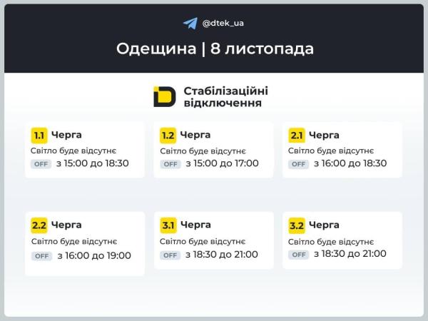 Обновлено в 19:10. ДТЭК обнародовал графики отключения электроэнергии в Одесской области. Отмечается, что у некоторых жителей региона электроэнергии может не быть до 3,5 часов. При этом одна очередь потребителей будет со светом целый день.