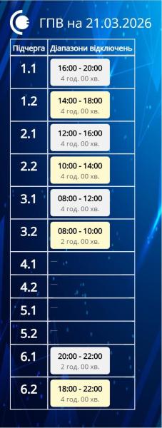 В Сумской области 21 марта у большинства групп потребителей электроэнергию будут отключать по одному разу на 2–4 часа, в зависимости от группы. При этом, как сообщает «Сумыоблэнерго», подгруппы 4.1, 4.2, 5.1 и 5.2 будут обеспечены электроэнергией в течение всех суток.