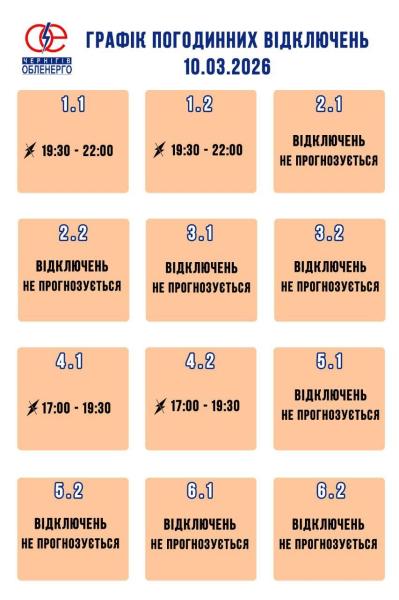 По данным «Черниговоблэнерго», 10 марта в Черниговской области в большинстве очередей электроэнергию не будут выключать. Не будет света в подочередей 1.1, 1.2, 4.1 и 4.2, продолжительность отключений составит 2,5 часа.