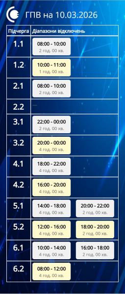 Согласно команде НЭК «Укрэнерго», 10 марта по Запорожской области будут применены графики почасовых отключений (ГПО). Часы отсутствия электроснабжения по очередям (подочередям) (с учетом 30 минут на переключение):
