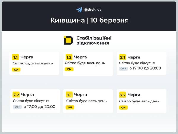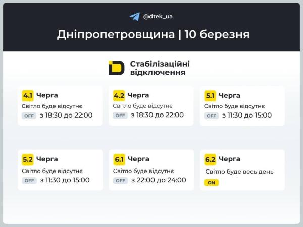 ДТЭК обнародовал график отключения света на 10 марта для Днепропетровской области. В двух очередях (2.2 и 6.2) свет завтра будет весь день. Очереди 3.1 будут выключать свет дважды в сутки, остальным группам потребителей – один раз.