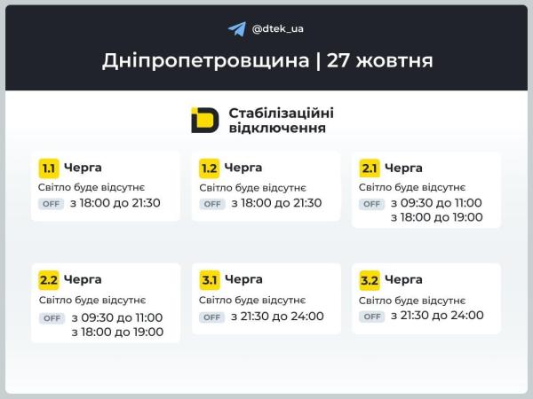 В свою очередь в Житомироблэнерго отметили, что на 15:00 27 октября НЭК «Укрэнерго» изменил применение количества очередей — с 16:00 до 24:00 часов — 2 очереди.