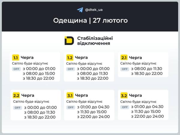 ДТЭК обнародовал график отключений для Одесской области. 27 февраля в регионе будут применять повременные отключения электроэнергии для всех очередей потребителей. Свет будут выключать от двух до трех раз в сутки.