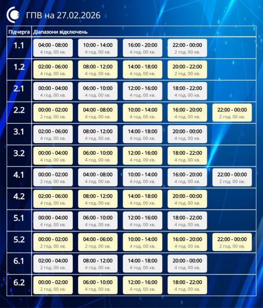 В Сумской области 27 февраля будет действовать график почасовых отключений в соответствии с объемами, доказанными командой НЭК «Укрэнерго». Как сообщили в «Сумыоблэнерго», в течение суток график может изменяться в зависимости от ситуации в энергосистеме Украины.
