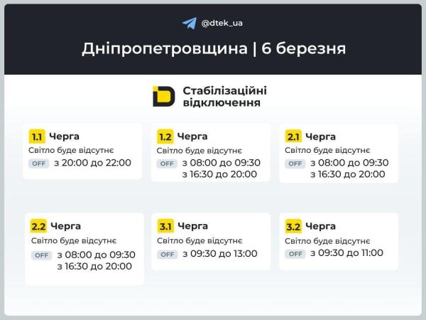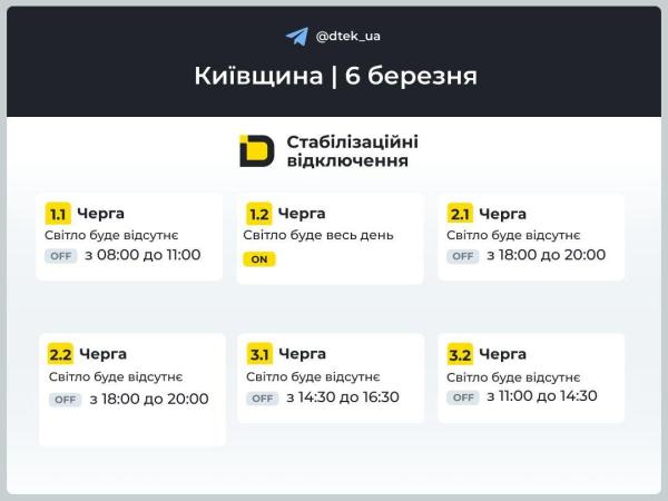 ДТЭК также обнародовал график отключений для Киевской области. Так, 6 марта в столичном регионе будут применяться повременные отключения в большинстве очередей потребителей. Согласно приведенной информации, в семи очередях отключения будут происходить только один раз в сутки. При этом у других пяти свет будет весь день.