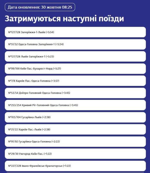 Ряд поездов опаздывает после атаки Российской Федерации по Украине. Задержки составляют до 6 часов.