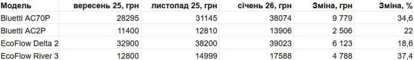 Цены на гаджеты растут неравномерно. Так, среди самых популярных станций EcoFlow Delta 2, которая подорожала с сентября на 18,6%, в то же время Bluetti AC70P прибавила сразу 34,6%. Сейчас стоимость станций отличается лишь на тысячу гривен, тогда как в начале осени Bluetti стоила почти на 5 тысяч дешевле.