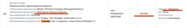 Согласно декларации, Петр Порошенко получил от Министерства финансов Венгрии 51,8 млн грн в виде погашения облигаций, а также 720 904 грн процентов. Общая сумма поступлений из Венгрии составляет 52,538 млн грн.