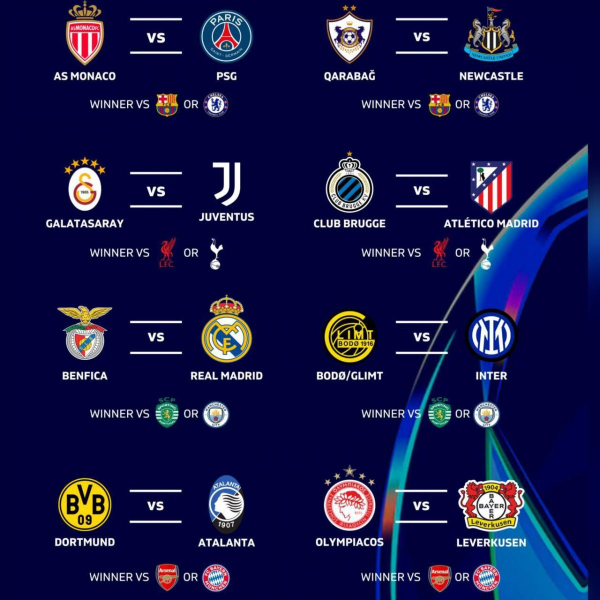 Победители этих пар выйдут в следующий раунд – 1/8 финала Лиги чемпионов, где их будут ждать восемь лучших команд группового этапа – «Арсенал», «Бавария», «Ливерпуль», «Тоттенхэм», «Барселона», «Челси», «Спортинг» и «Манчестер Сити».