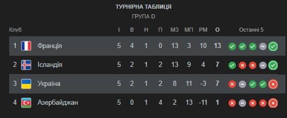 По результатам предпоследнего тура первое место в группе D занимает Франция, оформив 4 победы и сыграв один матч вничью. Французы с помощью уверенной победы над Украиной смогли напрямую выйти на ЧМ-2026. Украина же опустилась на третье место и имеет 7 очков, как и сборная Исландии.