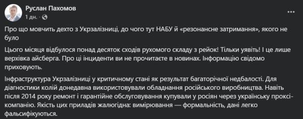 По словам Пахомова, только в этом месяце на Укрзализныце произошло более десятка сходов подвижного состава с рельсов. Он отмечает, что о большинстве инцидентов общество не узнает, поскольку информацию, по его словам, сознательно скрывают. Предприниматель считает, что железнодорожная инфраструктура сейчас находится в критическом состоянии из-за многолетней халатности и использования оборудования российского производства. Даже после 2014 года, утверждает он, ремонт и гарантийное обслуживание осуществлялись через украинскую прокси-компанию, которая работала с российскими поставщиками.