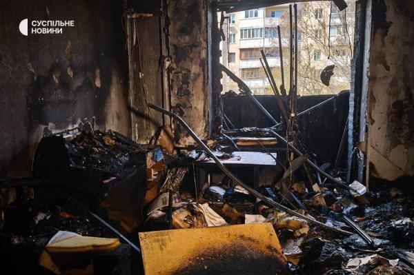 В сети показали, как выглядит квартира мужчины, расстрелявшего людей в Голосеевском районе Киева. Фото опубликовало «Суспільне». На снимках видно, что квартира сильно пострадала от пожара – на стенах и потолке видна копоть, обломки мебели, полностью выбитые окна.