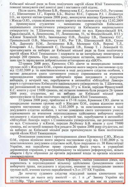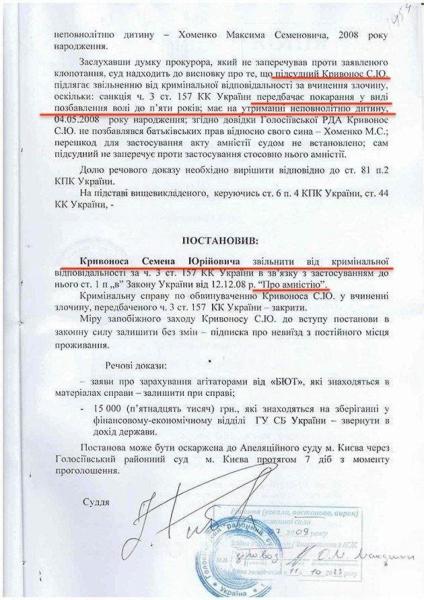 Издание напомнило, что директор НАБУ Семен Кривонос получил обвинительный судебный приговор по делу о подкупе избирателей в пользу Блока Юлии Тимошенко. Однако в июне 2009 года был освобожден по амнистии из-за наличия у него малолетнего ребенка. По информации СМИ, он якобы усыновил мальчика и благодаря этому избежал тюремного заключения.
