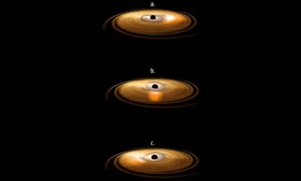 По мере того, как звезда разрывалась на части, ее обломки оседали в быстро вращающийся диск вокруг черной дыры. В то же время мощные струи вещества выбрасывались наружу со скоростью, близкой к скорости света.