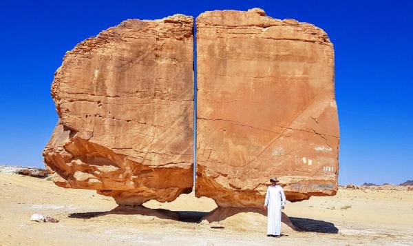 В оазисе Тайман в Саудовской Аравии есть одно из самых загадочных геологических образований на Земле — на двух почти идеальных постаментах, находится огромный валун диаметром около 9 м и идеально расколотый надвое.