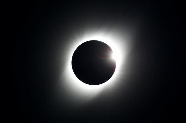 По мере приближения полной фазы можно будет наблюдать два быстрых оптических эффекта. Сначала появятся четки Бейли – цепочка ярких точек, где последние прямые лучи солнечного света проходят через долины на неровном крае Луны. Почти сразу они сменятся эффектом бриллиантового кольца – одиночной вспышкой, знаменующей момент перед тем, как полностью обнажится корона.