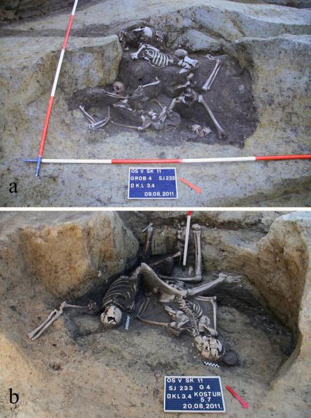 Отмечается, что первоначально скелеты были обнаружены в 2011 году в ходе археологических раскопок перед запланированным строительством в университете Осиека, который во времена Римской империи был известен как город Мурса. Хотя скелеты были целыми, они были обнаружены в колодце в разных положениях, в том числе головой вниз.