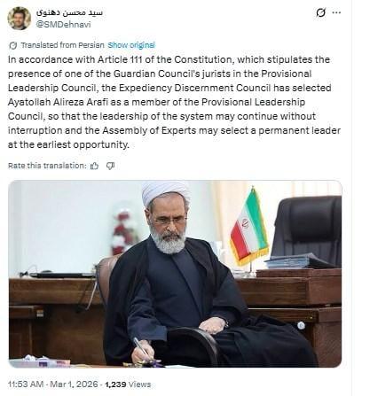 «Совет по определению целесообразности избрал аятоллу Алирезу Арафи членом временного руководящего совета», – говорится в сообщении пресс-секретаря совета Мохсена Дехнави на X.